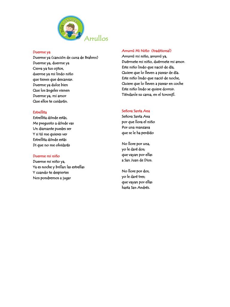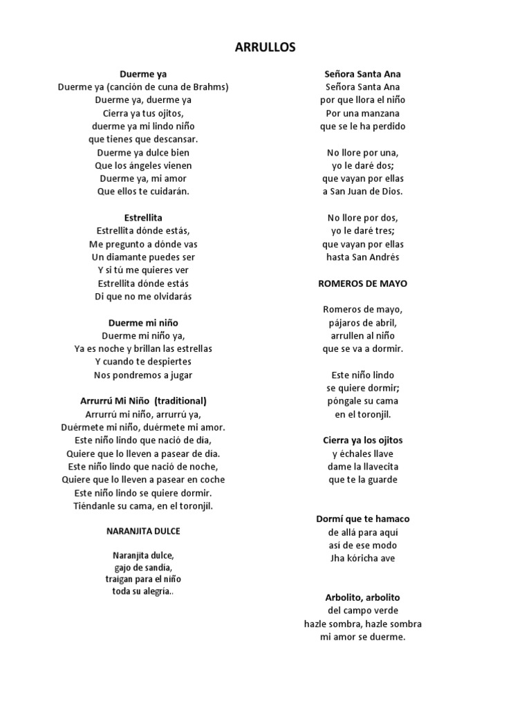 Duerme ya dulce bien Mi capullo de nardo Despacito duérmete Como la abeja en la flor Duerme ya dulce bien Duerme ya dulce amor Dulces sueños tendrás Al oír. Duerme Duerme mientras yo te arrullaré Con el hechizo de mi canción Que. Tu madre a ti te cuidará hoy que acabas de nacer.