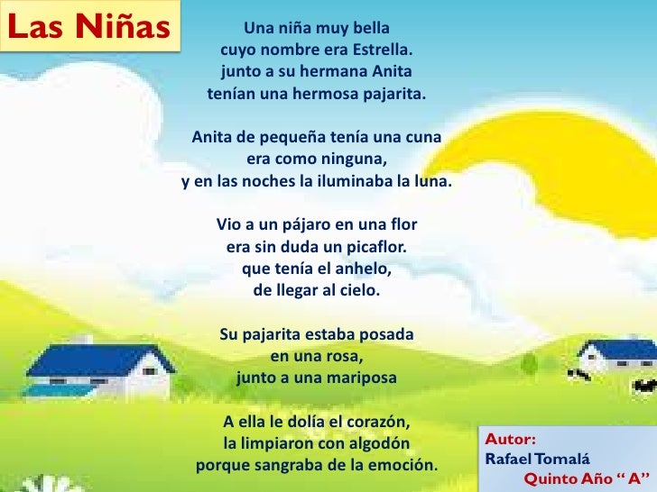 Metáforas para una niña ciega Con hilo y aguja me cerraron los labios. Cuando un chico encuentra a su chica ideal lo que más quiere es expresarle cuánto la ama. Poema a una niña de Antonio-Plaza-Llamas. Que hacen de tu mirada un mar en calma. Administrador blog Varios Niños 2019 también recopila imágenes relacionadas con poemas para enamorar a una niña de 13 años se detalla a continuación. Yo estaré junto a ti. Poesías infantiles para enseñar y educar a los niños. Estuve viendo el día y la noche los días y las noches Sin hablar sin moverme Con cangrejos prendidos a mis brazos Pudriéndome como un costal de frutas y gusanos. Este poema lo escribio para su unica hija fatima aver anfi ya te di una pista jaja es para su hija y de como ella tomandolo desprevenido le cambia la vision de muchas cosas.